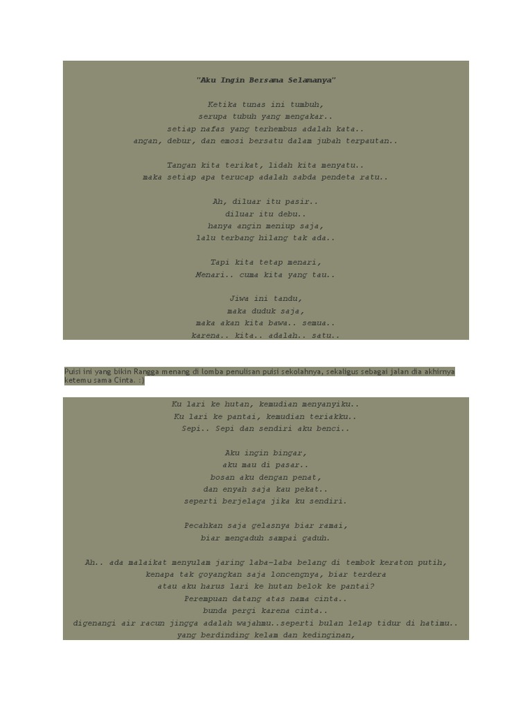 Puisi cinta aadc kulari ke hutan. Kumpulan puisi di film ada apa dengan cinta tahun 2002. Aku ngin bingar. Ia langganan juara lomba puisi di sekolahnya yang rutin diadakan tiap tahun.