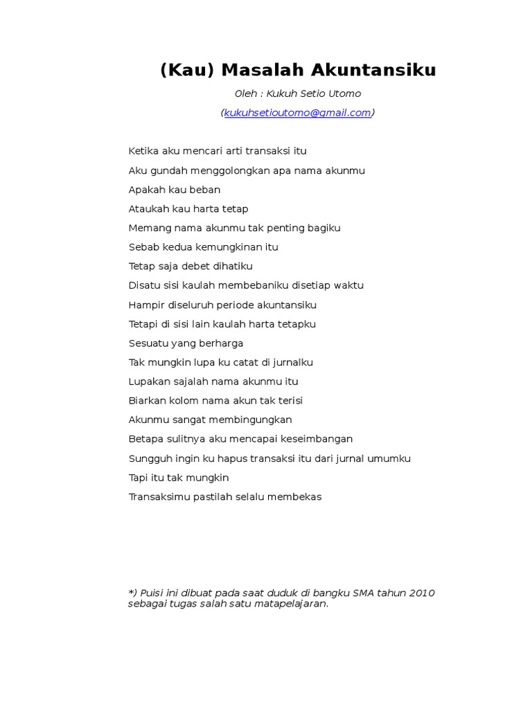 Puisi cinta anak akuntansi. Debetlah cintaku di neraca hatimu kan ku jurnal setiap transaksi rindumu hingga setebal laporan keuanganku. Puisi cinta anak akuntansi wahai kekasihku. Jika dalam 344 daftar ini tidak memuaskan kalian silahkan telusuri kumpulan contoh puisi bahasa inggris yang telah kami susun.