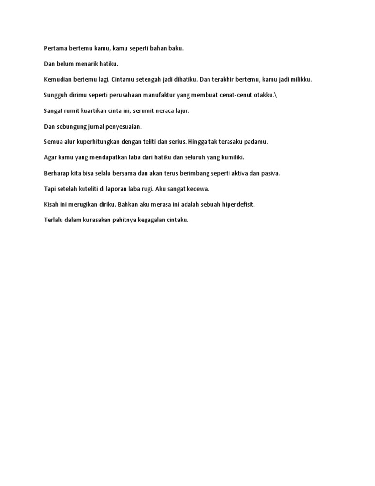 Saat pertama kusetorkan modal demi mendirikan usaha cinta kita kau tuliskan pada jurnal umum debit kas dan kredit setoran cinta perlahan aku dan kamu menjalani hari penuh bukti bukti transaksi akan indahnya cinta kita yang selalu kita arsip di buku cinta setelah menjurnalnya saat setelah kutuliskan cinta di sisi debit dan engkau menulisnya di sisi. Daftar puisi cinta terbaik. Klo diluar ada juga yg buat penelitian or jurnal akuntansi dg bahasa puisi jg.